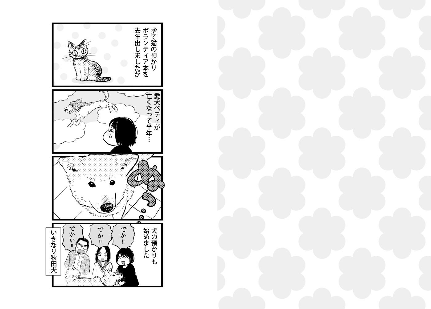 A5、52ページ。捨てられた犬を引き取って、新しい飼い主を探す活動のお手伝いをしています。今まで預かった3匹の犬との日常を描きました。売り上げはフード代の一部にしたいです!